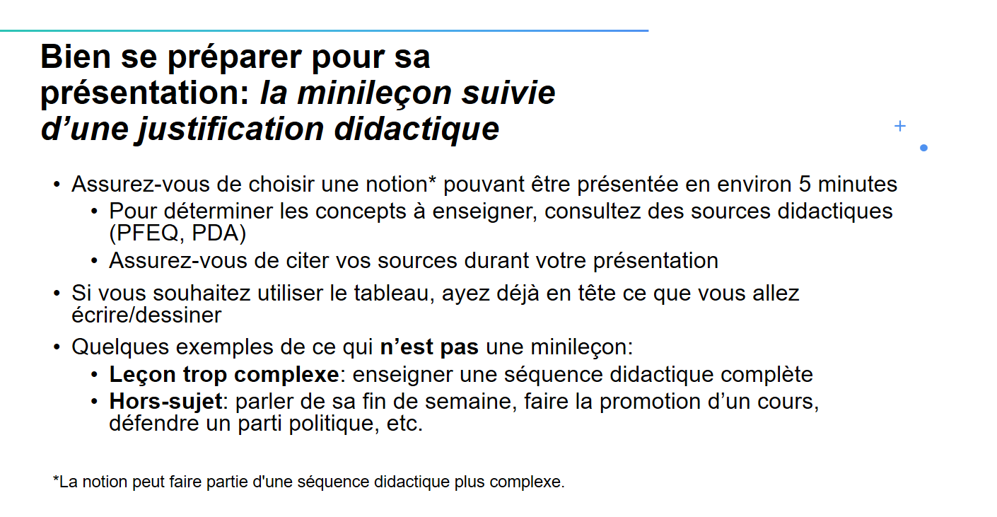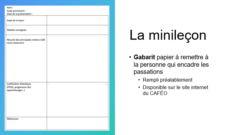 Vous devez enseigner une minileçon. Il peut s’agir d’une leçon élaborée pour un stage ou présentée dans un cours de didactique, ou d’une leçon créée spécialement pour cette évaluation. Vous devez ensuite justifier le choix de votre minileçon en vous appuyant sur des sources didactiques valides.